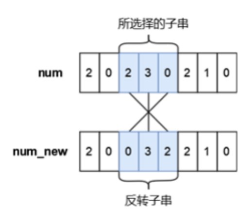 小蓝有一个长度均为 $n$ 且仅由数字字符 $0 \sim 9$ 组成的字符串,下标从 $0$ 到 $n-1$,你可以将其视作是一个具有 $n$ 位的十进制数字 $num$,小蓝可以从 $num$ 中选出一段连续的子串并将子串进行反转,最多反转一次。小蓝想要将选出的子串进行反转后再放入原位置处得到的新的数字 $num_{new}$ 满足条件 $num_{new}<num$,请你帮他计算下一共有多少种不同的子串选择方案,只要两个子串在 $num$ 中的位置不完全相同我们就视作是不同的方案。